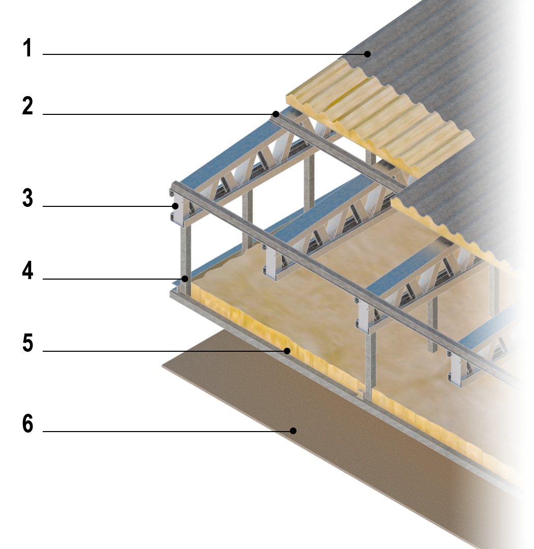 La lana de vidrio es el aislante térmico y acústico y se apoya sobre la estructura de cielorraso. Con su ancho estandarizado de 1,20 metros, cabe perfecto eentre viga maestra y viga maestra, las cuales se modulan cada 1,20 metros, no habiendo así puentes térmicos ni acústicos en toda la superficie de la cubierta.